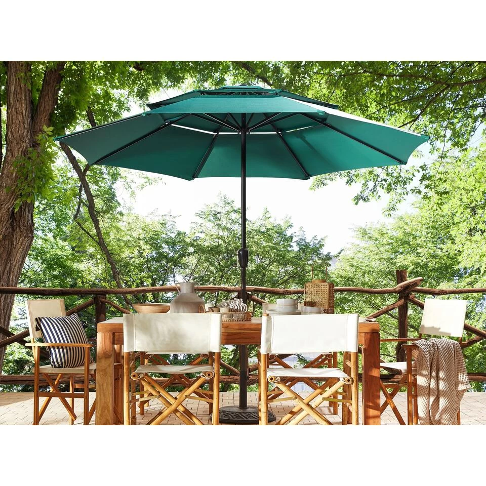 Moderne buitenparaplu. Deze tuinparasol beschermt je huid tegen zonnebrand en zorgt voor de gewenste schaduw tijdens warme zomerdagen. De duurzame gepoedercoate stalen paal heeft een achthoekige luifel van hoogwaardig en UV-bestendig polyester. Dankzij het slingermechanisme kan je de parasol gemakkelijk openen en sluiten, terwijl de ventilatieopeningen zorgen voor een goede luchtcirculatie.