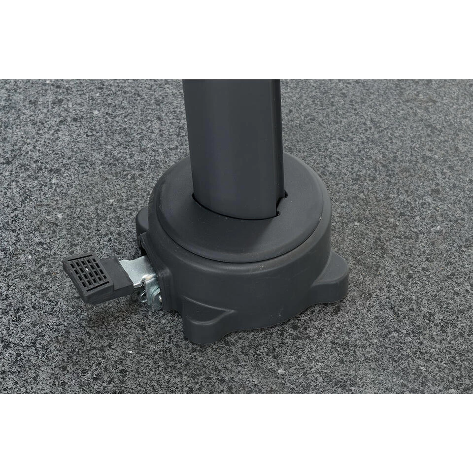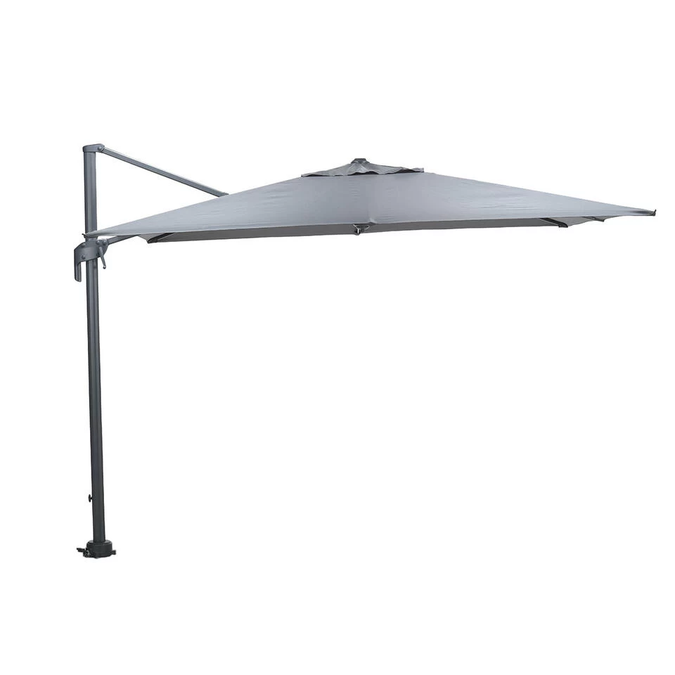 De zweefparasol is verticaal te kantelen en 360 graden rond te draaien. Ideaal om met de zon mee te bewegen zonder de hele parasol te moeten verplaatsen. Bij deze zweefparasol moet minimaal een 80 kg hawaii parasolvoet. De zweefparasol is licht van gewicht en kan makkelijk opgeborgen worden in de schuur wanneer er slecht weer aan komt. Doe je de parasol ’s avonds dicht dan kun je er een hoes over heen doen, die los aangeschaft kan worden. Het parasoldoek heeft een donker grijze kleur.