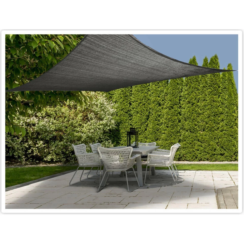 Schaduwdoek/zonnescherm/zonwering vierkant grijs 3 meter. Een grijze schaduwdoek van geweven kunststof met een lichte glans, ideaal om een schaduwplek te creeren in uw tuin. Deze schaduwdoek heeft een afmeting van 3 x 3 m en een vierkante vorm. De schaduwdoek biedt bescherming tegen UV-straling en is waterdoorlatend. Wordt geleverd met vier touwen van 350 cm per stuk zodat u deze eenvoudig aan bijvoorbeeld uw schutting kunt bevestigen. Materiaal: 100% polyethyleen. Schaduwdoeken/zonnezeil/zonnedoek/zonwering tuin artikelen en accessoires.