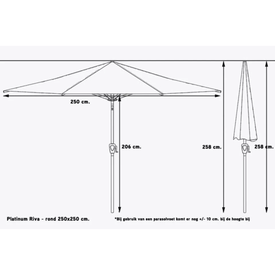 Met de Platinum Riva parasol kan je een heerlijke schaduwplek creëren. De Riva parasol is rond en heeft een doorsnede van 2,5×2.5 meter. Doormiddel van het handige opdraaimechanisme kan je de parasol eenvoudig in- en uitklappen. De mast van de Riva bestaat uit twee delen. Dit zorgt ervoor dat je de parasol uit elkaar kan halen en gemakkelijk kunt opbergen. Het parasoldoek van de Riva parasol 2.5×2.5 meter is antraciet van kleur. Het doek is van goede kwaliteit, deze is namelijk gemaakt van 100% polyester. Daarnaast is het parasoldoek voorzien van een speciale vuil- en waterafstotende coating. Deze coating zorgt er ook voor dat het doek minder snel van kleur verschiet. Aan het uiteinde van de baleinen van de Riva parasol is een speciale doekspanner gemaakt. Hierdoor staat het doek altijd mooi strak gespannen. De Riva parasol is voorzien van een handig kniksysteem. Hiermee kan je goed inspelen op de stand van de zon. Je kantelt het parasoldoek daarmee namelijk eenvoudig schuin in de baan van de zon. De parasol vangt in de schuine stand wel meer wind. Wij adviseren dan ook om daar goed het oog in te houden.